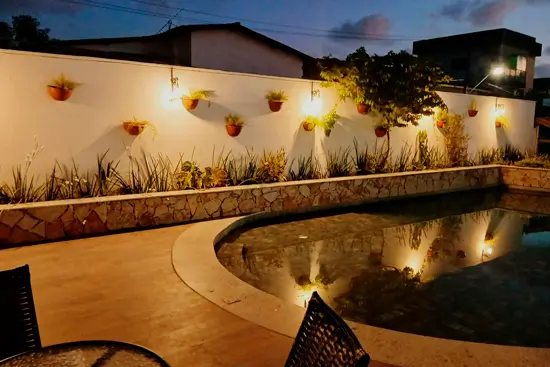 A pousada conta com árvores, arbustos floridos, um extenso gramado e floreiras, um atrativo para borboletas, pássaros e iguanas que escolheram esse aprazível lugar para fazer de sua morada.