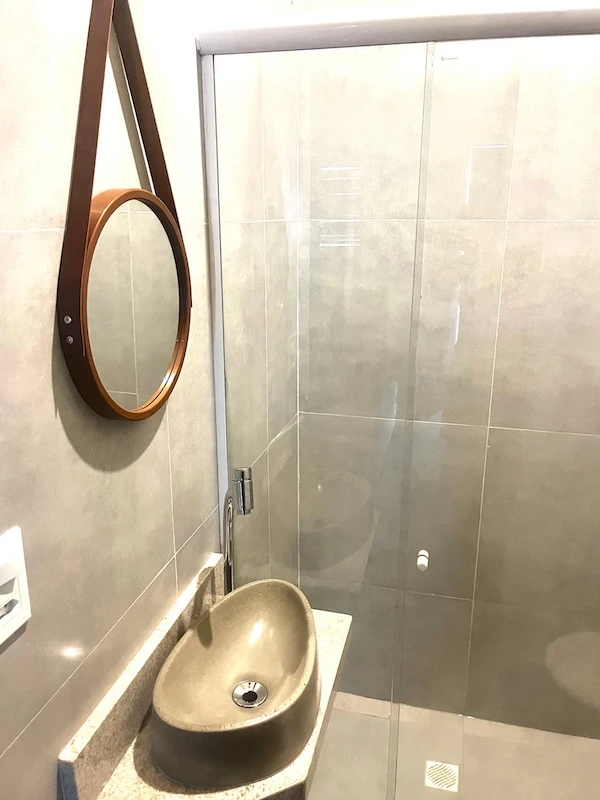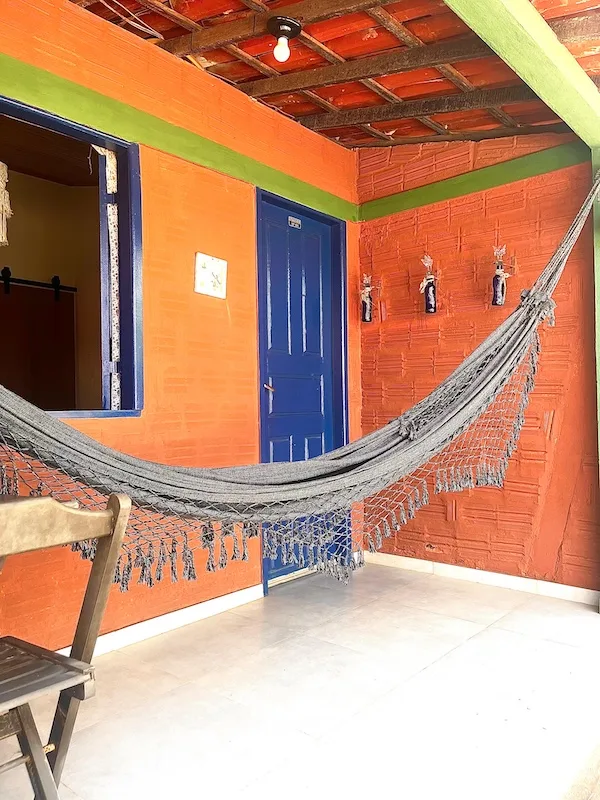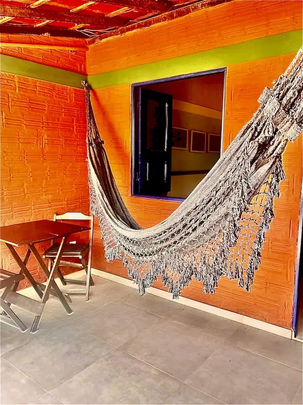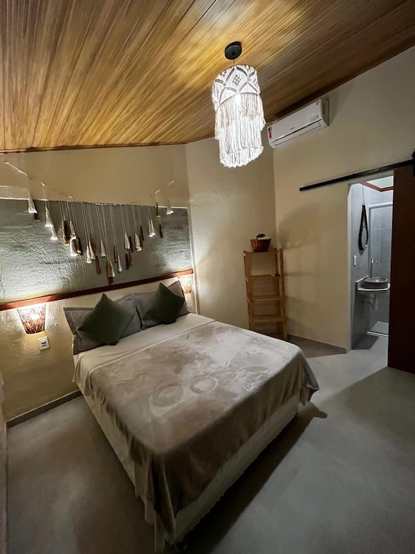 Suíte nova, com cama de casal, 18 m², banheiro com ducha quente smart TV 32″, frigobar, ar condicionado e varanda com rede e vista para o jardim e piscina.