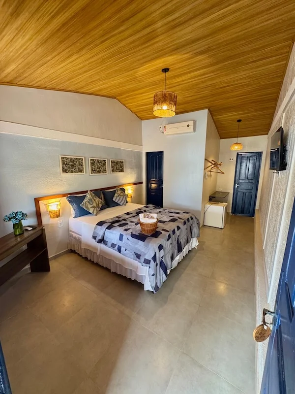 Suíte nova, com uma cama de casal queen, 24m², ar condicionado, banheiro com ducha quente, smart TV 32″, minibar, varanda com rede e vista para o jardim e piscina.